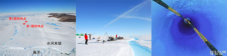 - 南極氷床から流れ出るラングホブデ氷河の接地線付近で、氷全層の熱水掘削に成功。