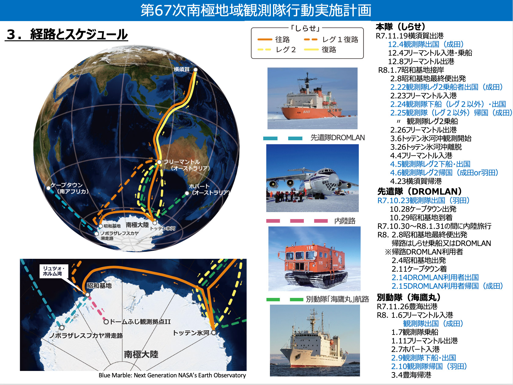 本日文部科学省で開催された第167回南極地域観測統合推進本部総会において、第67次南極地域観測行動計画が決定しました。同隊は、南極観測船「しらせ」に乗船して昭和基地に向かう本隊の他に、南極航空網(DROMLAN)を利用して南極入りする先遣隊、東京海洋大学の練習船「海鷹丸」で観測する別動隊の3隊に分かれて活動します。また、9月の南極地域観測統合推進本部連絡会において夏隊員15名、越冬隊員2名、同行者14名を追加決定し、本日の総会で同行者4名を追加決定いたしました。これにより、青木隊長(兼夏隊長)、江尻副隊長(兼越冬隊長)を始めとする既決定者を含めて、第67次南極地域観測隊は113名(夏隊65名、越冬隊29名、同行者19名)となっています。