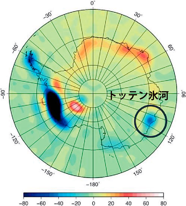 2002-2015の質量損失(福田、2018)トッテン氷河は東南極で最も大きく氷が減少していることがわかります。