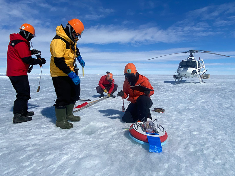 図2:氷上に設置した波浪ブイに再訪し海氷計測、海洋計測を行った