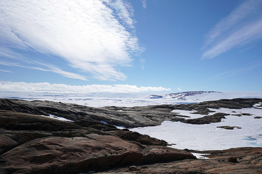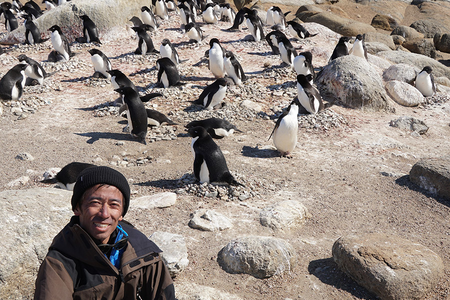 こうした事前準備を通して、実際に南極観測隊に、そして南極の世界に飛び込むのだが、とにかく味わったことのない異世界にただただ圧倒され、感動の渦に巻き込まれ続けたというのが一番の印象である。氷山や氷海の姿にはじまり、オーロラ、ペンギンやアザラシなどの動物、地球の原始の姿を想像させるような壮大なスケールの景色、大氷河、氷床など、とにかく毎日が感動の連続。どうやったらこの世界をみんなに伝えられるのだろうと悩みながら毎日カメラのシャッターを切った。また生徒にとって展開性に富むよう、意識的に自分をフレームの中に入れることも心がけた。私がこの観測隊に参加する一番の意味は、生徒にとって身近な人が異世界にいるという文脈だと常々思っていた。そのためただ景色や動物の姿をフレームに収めるのではなく、そこに見知った人が写っていることによって、子どもたちへの伝わり方が重層的になると思い、普段は決してやらない自撮りも南極ではよくやるようにしていた。