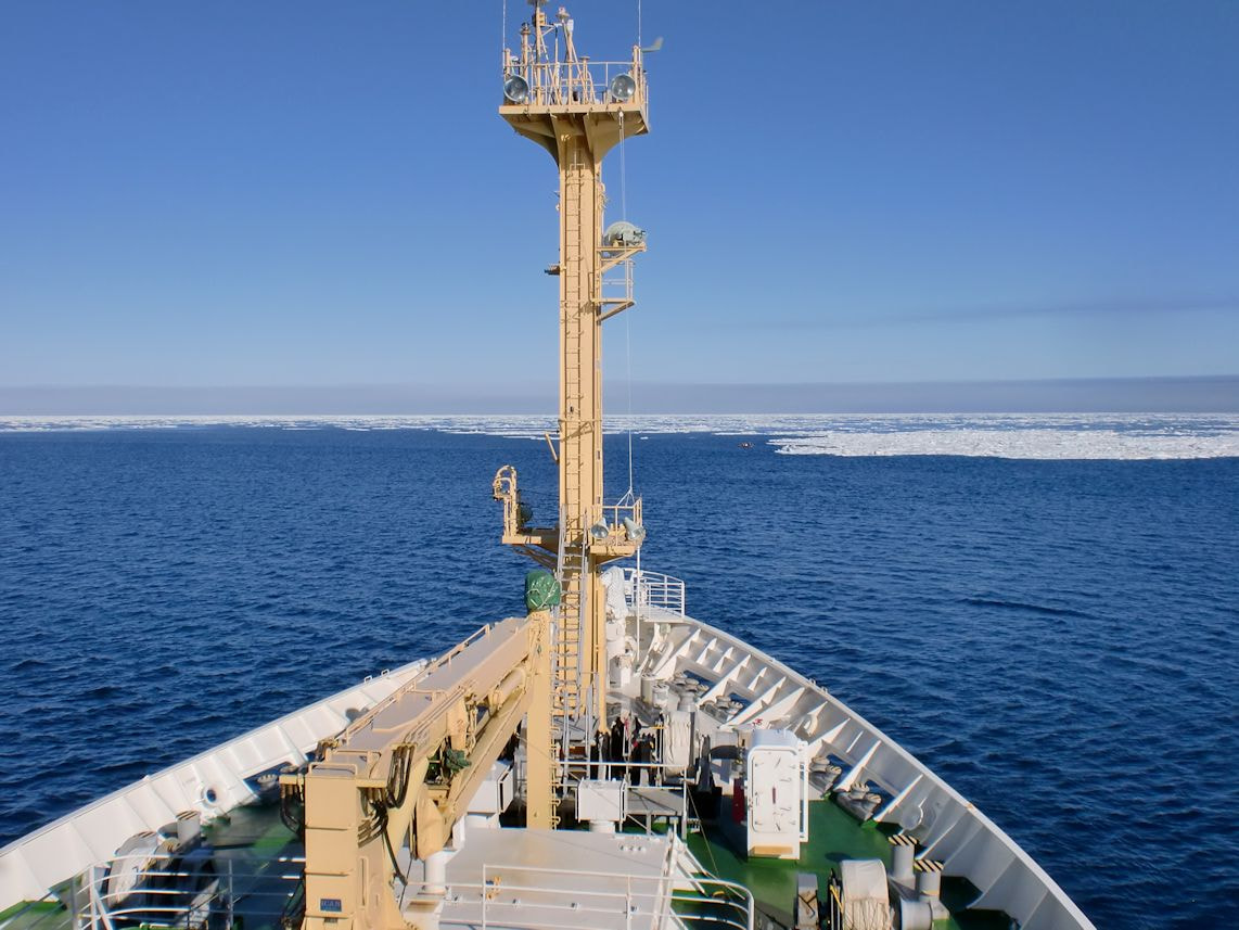 写真1:アラスカ・バロー岬沖 (71°25’N, 158°40’W)を航行する「みらい」の船首から望む海氷。