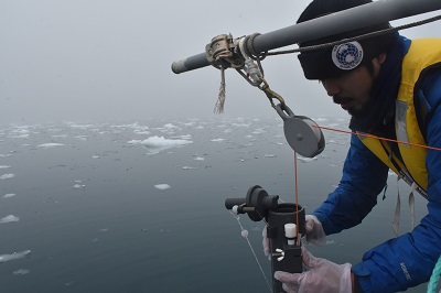 InglefieldフィヨルドはTracy氷河やHeilprin氷河など流れの速い氷河が複数流入するフィヨルドです。これらの氷河から流入する淡水や土砂が、Inglefieldフィヨルド内の物質循環や動・植物プランクトンに与える影響を調べるため、フィヨルド内で採水と動・植物プランクトンのサンプリングを行いました。また、氷河の末端変動と海底地形の関係を調べるために、ソナーによる測深を行いました。これらの観測は、カナック村の研究協力者が操船する小型ボートで実施したものです。