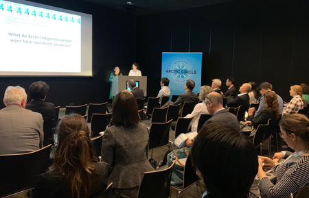 このArctic Circle AssemblyでArCSは毎年セッションを企画していますが、今年は初めて北極先住民とのダイアログを取り込み「Science Meets Society: Toward The Co-Designing of Arctic Research」と銘打った野心的なセッションが笹川平和財団のサポートで開催されました。そのゲストとして招聘されたのがロシア・サハ共和国で先住民文化の研究と権利獲得活動に携わるU. Vinokurova北方圏芸術大学教授。日本に詳しい彼女ならではの、非北極国と北極先住民が連携するヒント満載の議論でした。実はArctic CircleのセッションでアジアのACオブザーバー国が北極先住民を招聘したのは初めてのことだそうで、日本と同共和国の長い協働の歴史の成果とも言えるでしょう。