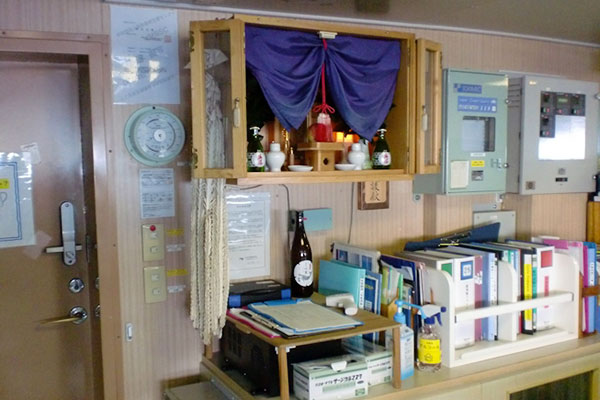 船内の神棚に参拝しました 北極海からのメッセージ みらい航海2020 公開日:2020/09/21 船内には神棚があります。航海の安全を守る神である金毘羅様が祭られています。いつもは航海の始めに乗船者全員でお参りするのですが、今年はコロナの影響で密を避けるため、個別に参拝しました。(2020/09/21) 前のページに戻る