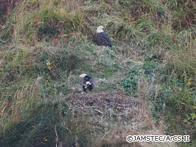 陽が昇って明るくなり、岸壁の崖の上を見るとハクトウワシの巣がありました。
