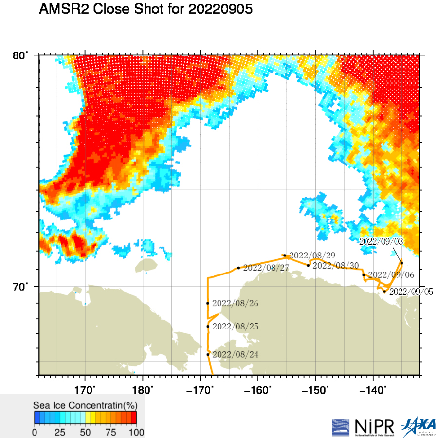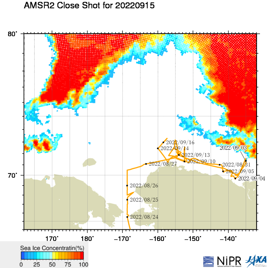 北極海の海氷状況と「みらい」の位置。