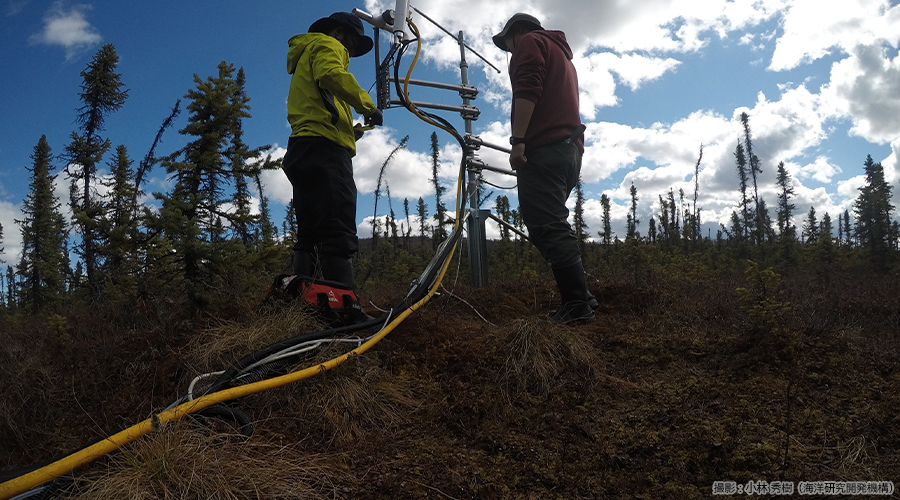 ほかにも、海洋研究開発機構の研究の一環として計画していた永久凍土融解により森林生態系がどのように変化するかを調べる土壌温暖化実験区の構築を進めました。5月中旬より地面に約1.5 mの孔を数十本掘って棒状のヒーターを埋めました。永久凍土層を掘削するのは初めての経験で、当初の計画より時間がかかったものの、アラスカ大学の共同研究者に協力していただき6月中旬には、ヒーターを設置することができました。この実験区では、温室効果ガスフラックスの長期変動をモニタリングするための自動開閉チャンバーを設置して、観測を始めています(写真2)。