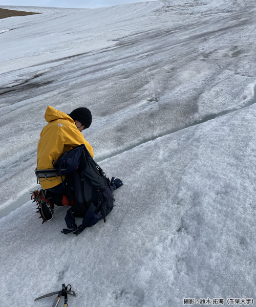 また、氷河に涵養される水の起源や流出に至る水文過程の理解のために、氷河表面を流下する融解水を採取し、成分を分析します。