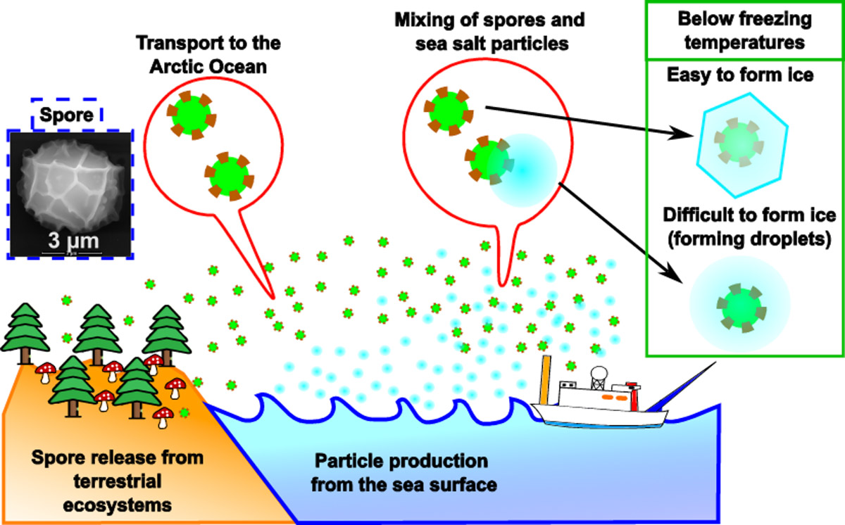 Figure 1: Schematic diagram of spore release and sea salt particle production, their trasnport to the Arcitc Ocean, and changes in their ice nucleating ability through mixing.