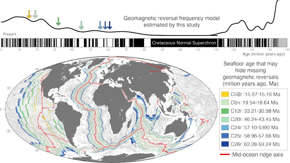 Several studies have predicted that not all geomagnetic reversals have been discovered, but it was unknown in which periods they might be hidden. The researchers led by the National Institute of Polar Research used a statistical method called adaptive kernel density estimation to model the frequency of geomagnetic reversals at high temporal resolution. Based on the model, they proposed that undiscovered reversals may be hidden in four periods after the Cretaceous Normal Superchron.