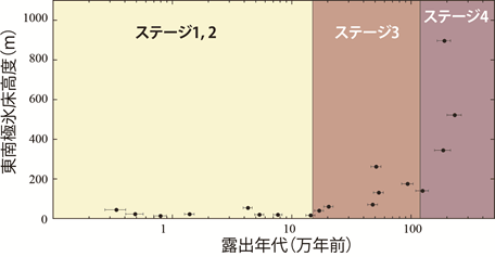 図4 採取試料の露出年代と高度。セール・ロンダーネ山地における氷床高度が約250万年前から、約500m以上低下したことが明らかになった。