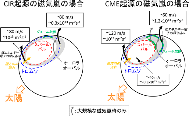 図3:CMEとCIR起源の磁気嵐の発生初日における極域イオン上昇流の特徴のまとめ図。