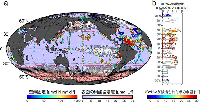 (a)今回南極沿岸域で窒素固定が検出されたことによって、窒素固定が全球規模のプロセスであることが示された。図中赤線はこれまで窒素固定が行われうる最低水温とされていた水温(20 ℃)の等温線。バックグランドは表面の硝酸塩濃度を示す。(b)UCYN-Aは北極から南極まで広く分布していることがわかる。各点の色は水温を示す。黒点は水温データのない点。