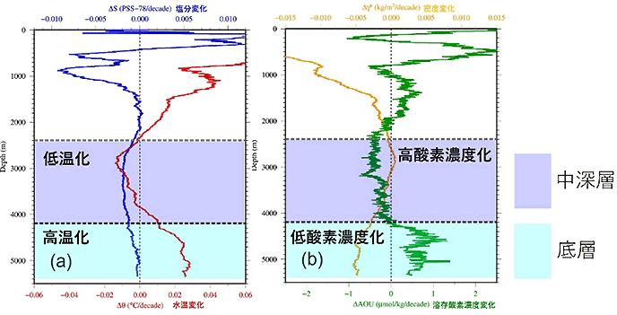 図2:底層に広がる高温化・低酸素濃度化傾向と、中深層に広がる低温化・高酸素濃度化傾向。南オーストラリア海盆における(a) 水温(赤)、塩分(青)、(b)AOU(緑、注5)、そして密度(オレンジ)の10年あたりの変化。縦軸には深度をとっている。深底層で高温化、AOUの増加(低酸素濃度化)の傾向が強く、中深層で低温化、AOUの低下(高酸素濃度化)傾向が強い。