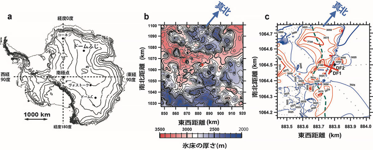 図1:ドームふじの位置と、掘削地点近傍の氷厚(氷床の厚さ)分布