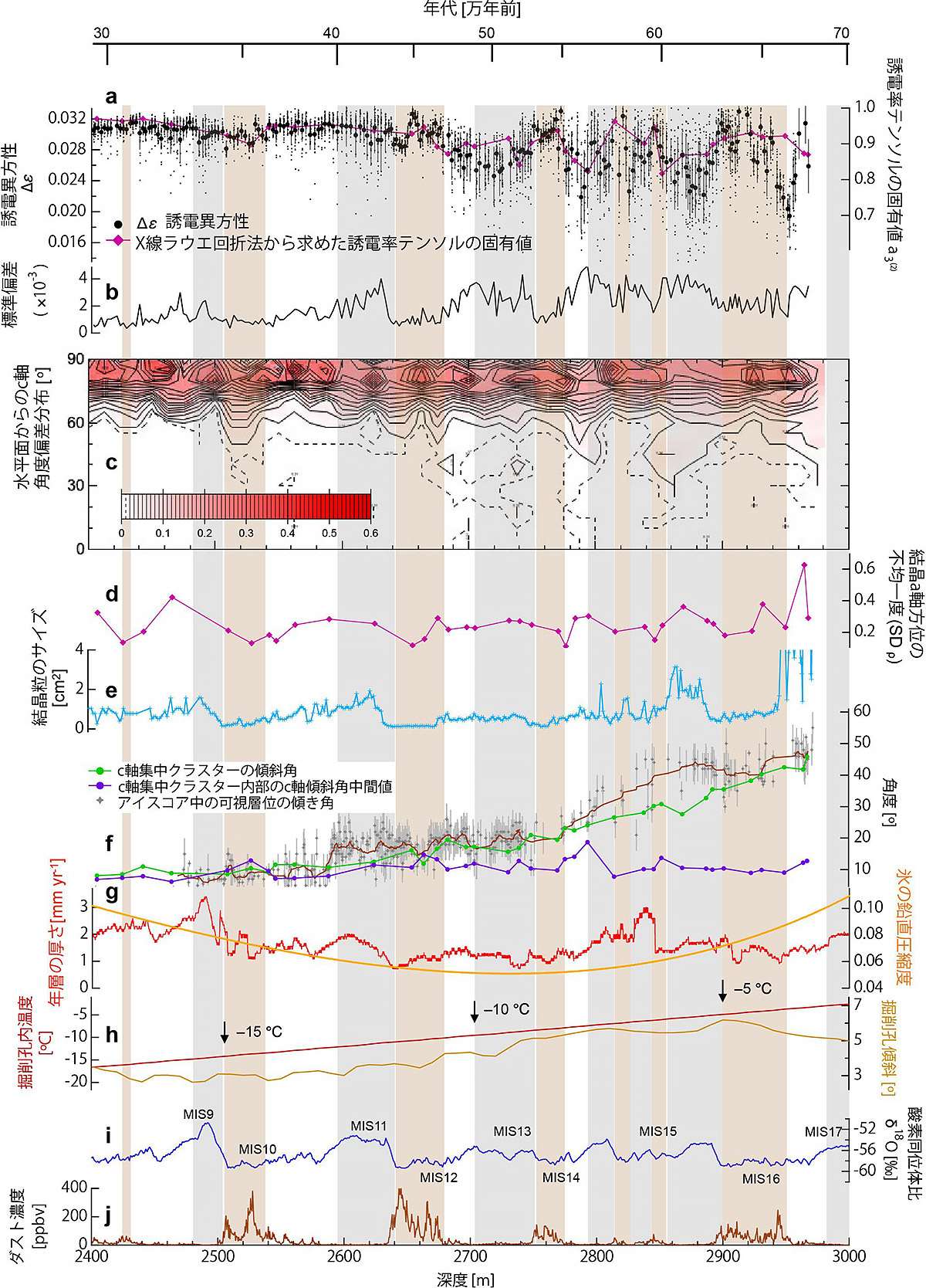 この図は、氷床コアの深さによる“結晶の向きの変化”を、他の指標と並べて読み取れるよう整理したもの。特に、氷に含まれる不純物(ダスト粒子)の多い層と少ない層で結晶の向きの揃い方(集中度)が大きく異なることが分かる。上段のグラフでは、誘電異方性(Δε)やX線回折によって求めた値から結晶の配向の強さを示し、下段のグラフでは、結晶の大きさや層の傾き、温度、同位体比、不純物濃度など、他の指標との対応関係を示している。灰色の網掛けは間氷期、茶色の網掛けは不純物を多く含む層を表す。