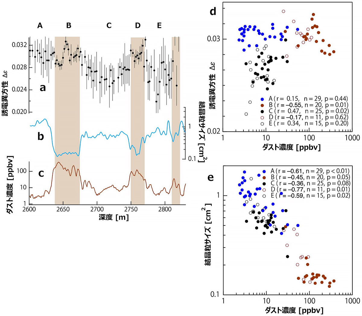 (d)はΔε値とダスト濃度の散布図、(e)は結晶粒径とダスト濃度の散布図を示す。各パネルの凡例内には、相関係数(r)、サンプル数(n)、および有意確率(p値)を記載している。A~Eは左側パネルに示す深度ゾーンに対応しており、そのうちゾーンBおよびDが不純物濃集層(不純物が多い層)である。