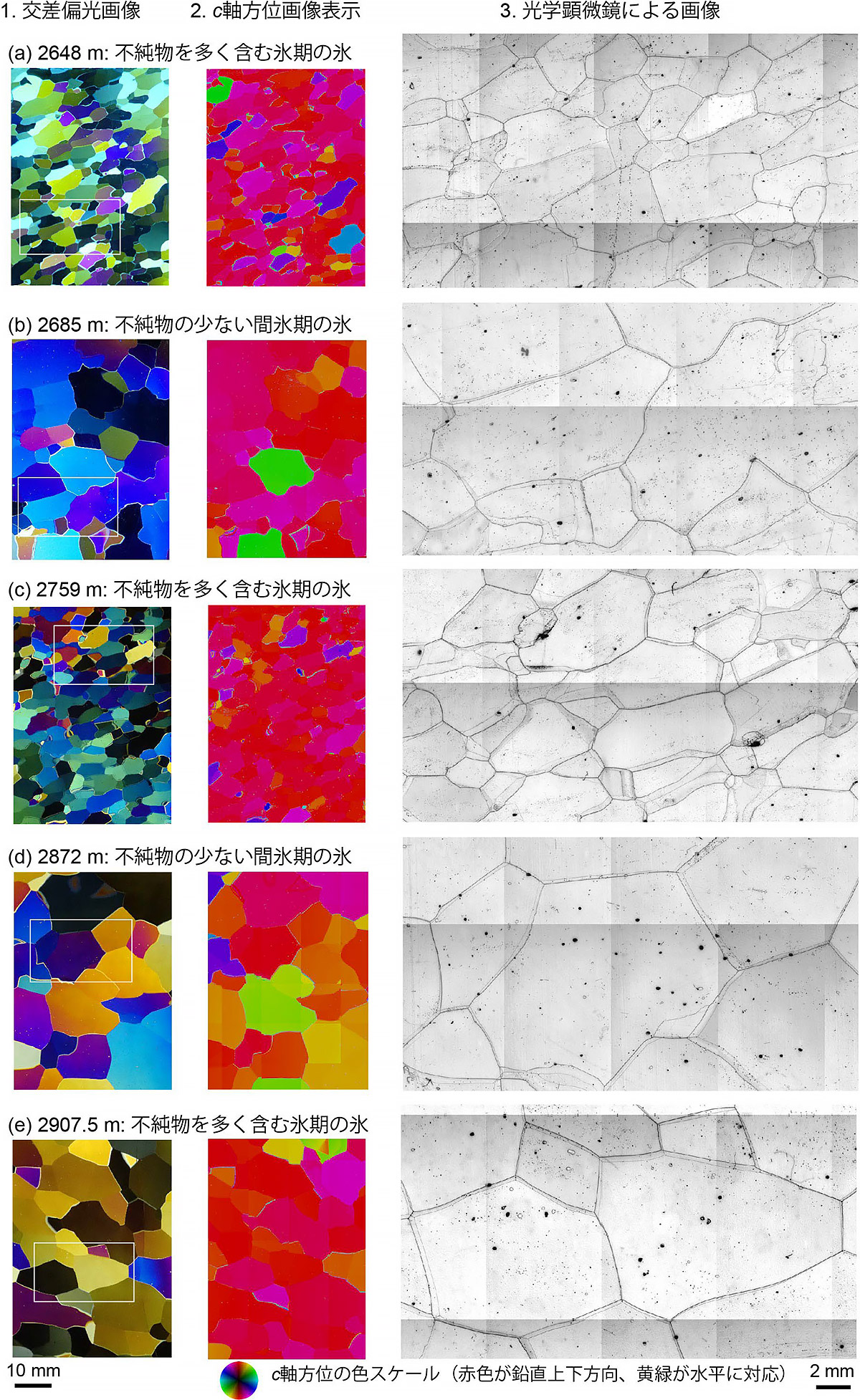 国立極地研究所の猿谷友孝学術支援技術専門員・藤田秀二教授、北海道大学の宮本淳教授らの研究グループは、南極ドームふじ基地で 2007年までに掘削された深さ3,035メートルの氷床コアの最深部約600メートル領域(ドームふじ全厚の約20%に相当)を対象に、氷の中で結晶がどの方向を向いているか(結晶配向)とその微細な構造を詳しく調べました。
