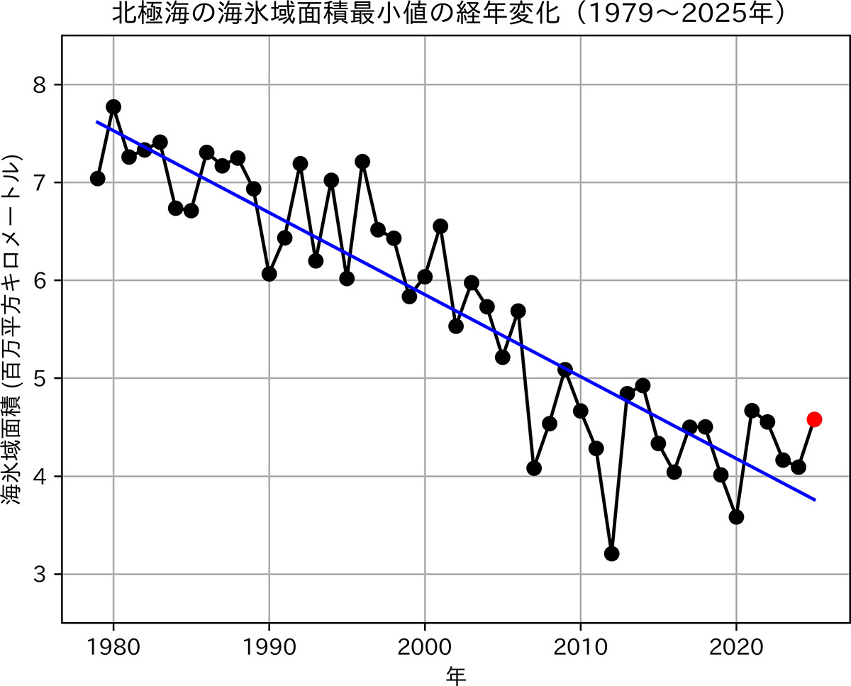 図4:北極海の海氷域面積最小値の経年変化(1979〜2025年、赤丸:2025年9月7日、青色実線:長期変化傾向(約8.4万平方キロメートル/年))。