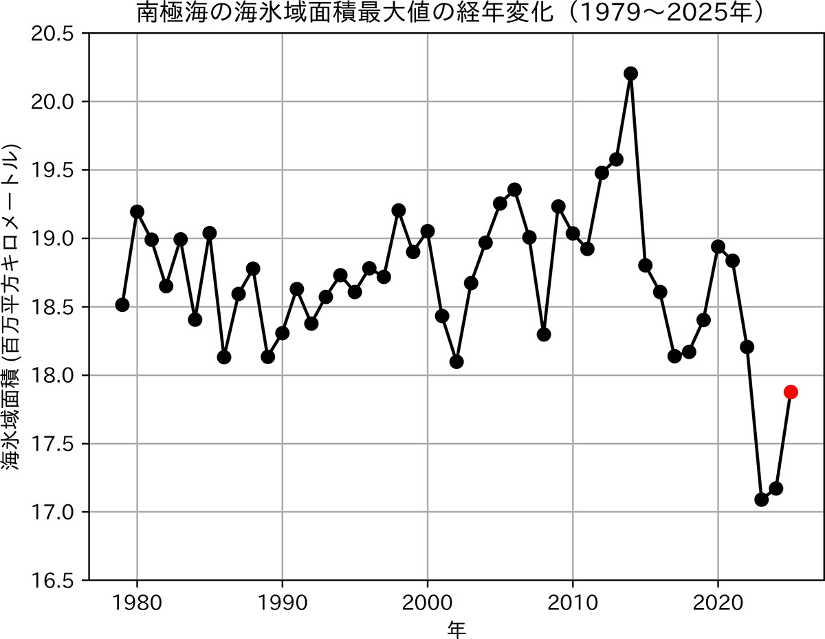 図6:南極海の海氷域面積年間最大値の経年変化(1979〜2025年、赤丸:2025年9月15日の年間最大値(1787万平方キロメートル))。