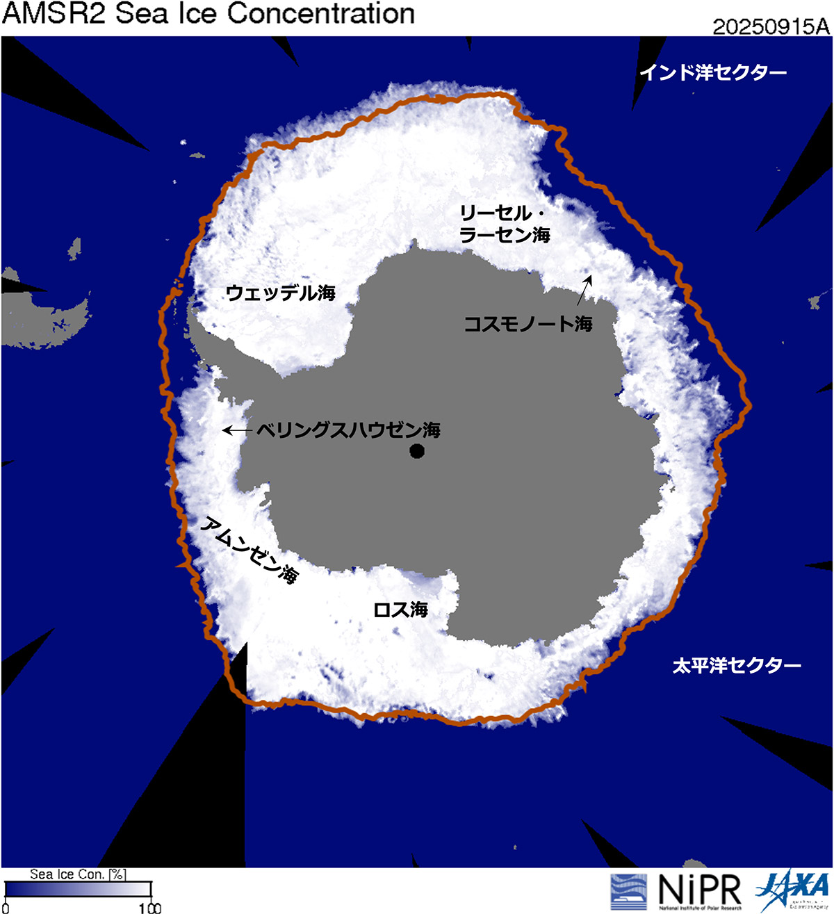 図7:2025年9月15日の海氷密接度の空間分布。橙色実線は同日の2010年代(2010〜2019年)平均の海氷縁(海氷密接度15%で定義)を表している。