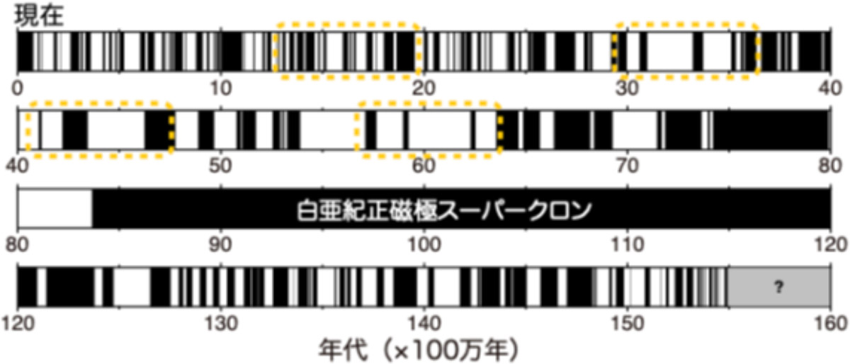 図1:地磁気極性年代表を図示したもの(Ogg, 2020, Geologic Time Scale 2020, Elsevierのデータを用いて作図)。黒色が現在と同じ地磁気極性、白色が現在と逆の極性を示す。今回発見された「未発見の逆転」が潜むと予想される年代を黄色の点線で囲っている。