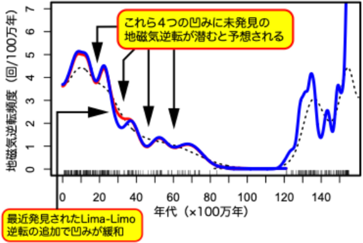 図2:滑らかな地磁気逆転頻度(黒の点線)(Constable, 2000のデータに基づき作図)と、本研究で推定された詳細な逆転頻度(青線)(地磁気極性年代表:Ogg, 2020, https://doi.org/10.1016/B978-0-12-824360-2.00005-Xのデータを利用)。赤線は近年発見された新しい地磁気逆転(Lima-Limo逆転:Ahn et al., 2021, https://doi.org/10.1093/gji/ggaa557; Yoshimura et al., 2023, https://doi.org/10.1029/2022GL102560)を加えたOgg(2020)の地磁気極性年代表に基づく逆転頻度。下部の黒い縦線は地磁気逆転が発生したタイミング。