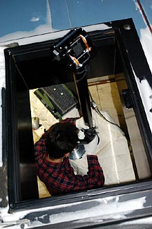 しかし、太陽の昇らない極夜期には太陽光を使った観測は出来ません。そこで考えられたのが、月の光を使ってオゾン全量観測を行うオゾン月光観測です。太陽光と月光を併用すれば、一年を通して同じ手法でオゾン量を観測することが出来るため、安定したデータが得られることになります。極夜明けの8月には、オゾンホールの発達が待ち受けています。 暗い中でのオゾン月光観測は、オゾン消失に先立つ動きを捉える、重要な意味を持っています。