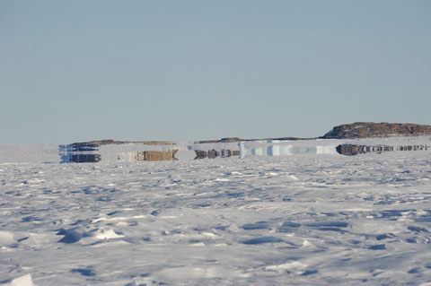 帰り道では眼前に海氷の蜃気楼が出現しました。蜃気楼は、冷えた地表付近と上層にできる太陽によって暖められた空気の層との温度差が大きいときに出現する現象で、天気のよい寒い日には昭和基地周辺でも時々みることができます。参考に、別の日にみられた蜃気楼の画像も掲載します。