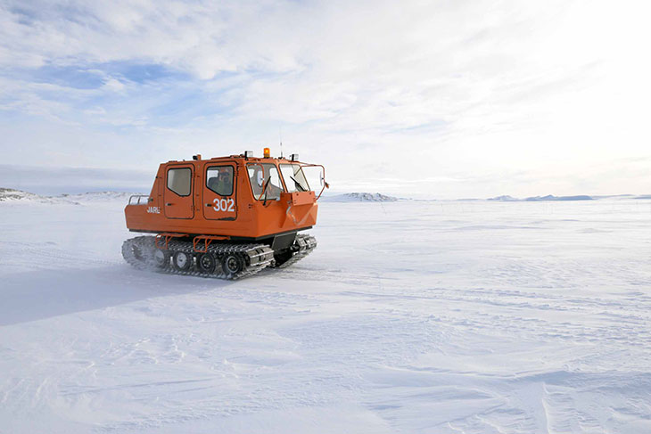 最後は雪上車とスノーモービルの運転講習、そしてルート工作。ほとんどの隊員は南極に来て初めて雪上車やスノーモービルを運転します。運転講習の後には海氷上へ出て、昭和基地のある東オングル島から隣の西オングル島までの安全なルートを作成しました。コンパスと地図を利用してポイントを決め、海氷の厚さを測り、赤旗を立てる、ということを繰り返して作成するルートは、これからの野外旅行においてわたしたちの命を守る大切な道標になるのです。
