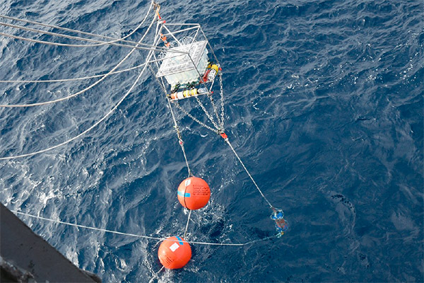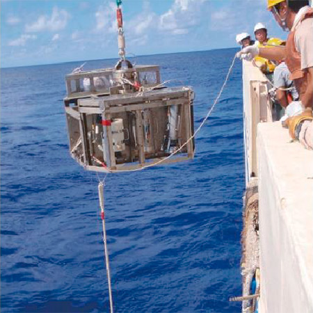 「海鷹丸」では表層から深層までの海洋環境や生態系の変動を調査するため、CTD-RMS(採水器付の塩分・水温・深度観測装置)観測やプランクトン採取のほか、水温・塩分などの物理観測とプランクトン採取などの生物観測を同時に一定期間継続できる係留系観測を実施します。