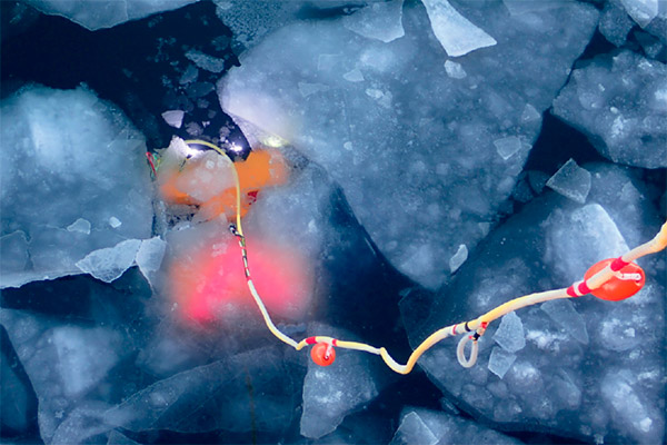 トッテン氷河近傍で海氷の下に潜り込んで、取り付けたセンサーから水温・塩分等の基本データや、海氷をどれくらい光が透過するかなどの情報を取得します。