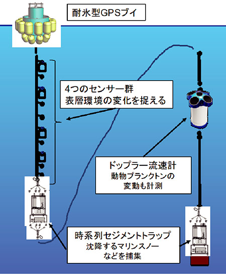 温度・塩分だけでなく、1年間分の沈降粒子(マリンスノー)を観測し生物の季節変動を解析する事ができます。